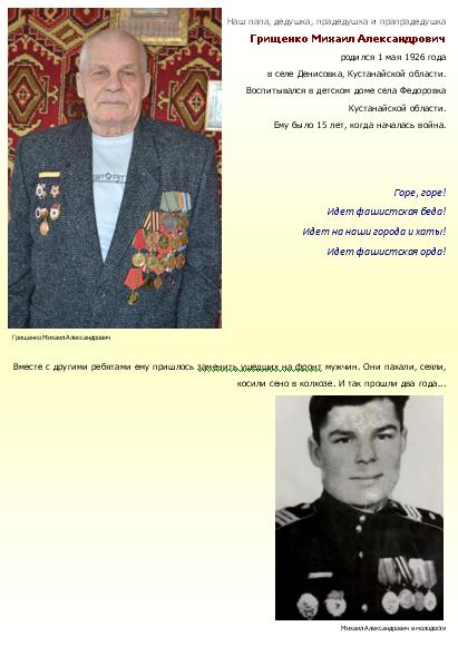 Семья Парфентьевых приняла участие в Социальном проекте "Наши деды ковали Победу", в котором они рассказали о подвиге своего прадедушки, ветерана ВОВ, Грищенко Михаиле Александровиче.